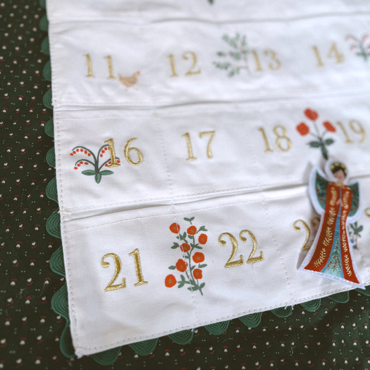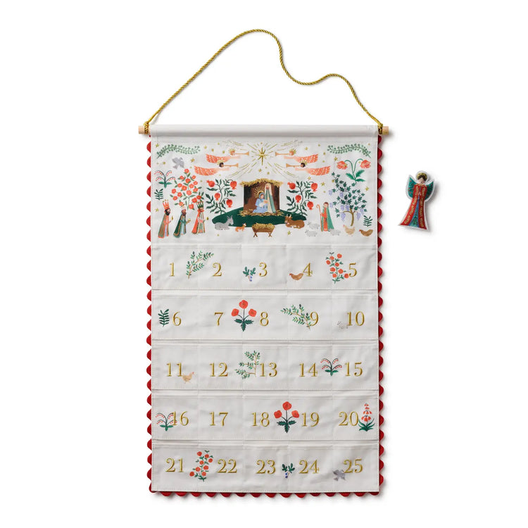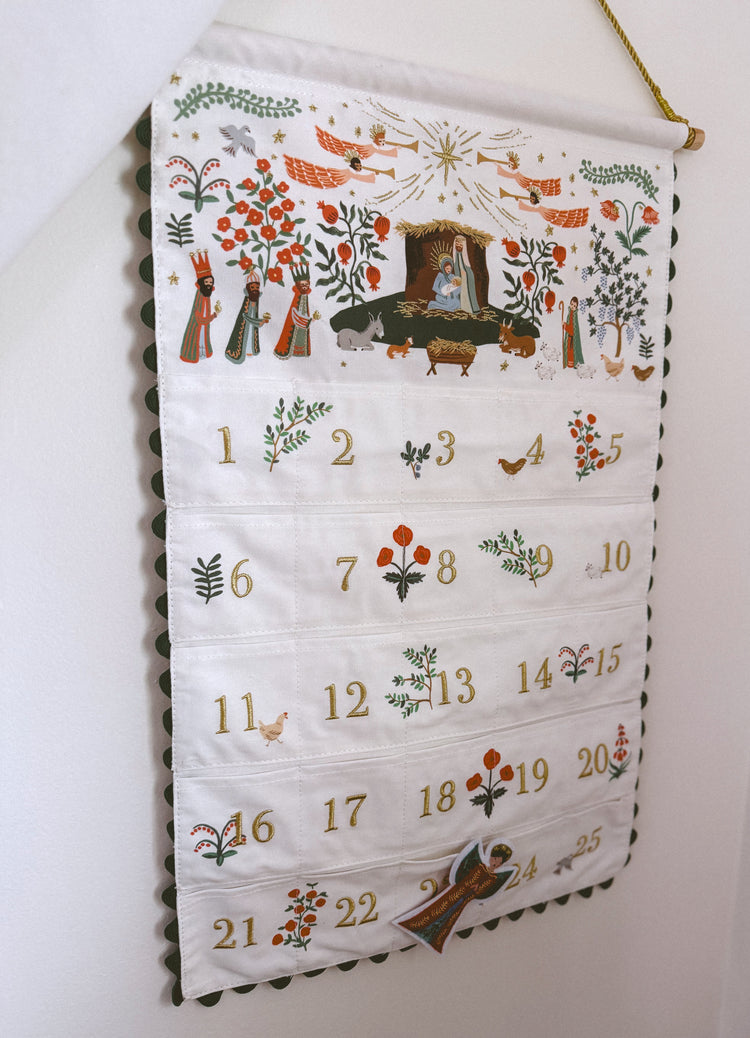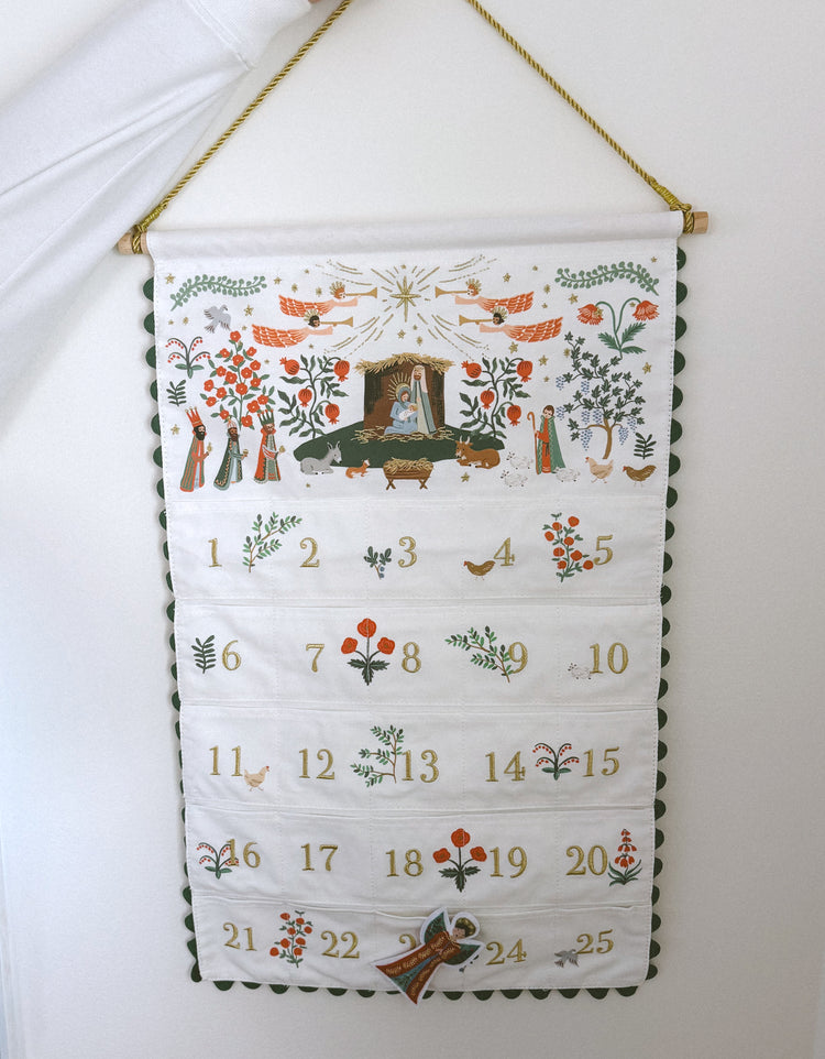 Count down to Christmas with our absolutely stunning fabric Advent calendar, featuring embroidered, nativity-inspired illustrations, metallic gold accents, and a stuffed figurine to move from day to day. The calendar hangs from a dowel with a rope cord for display.