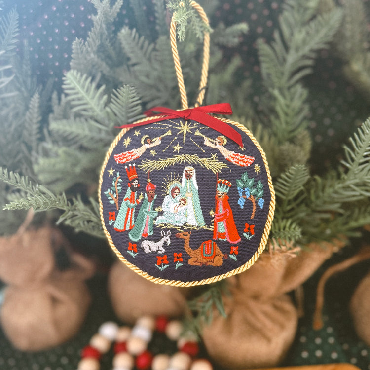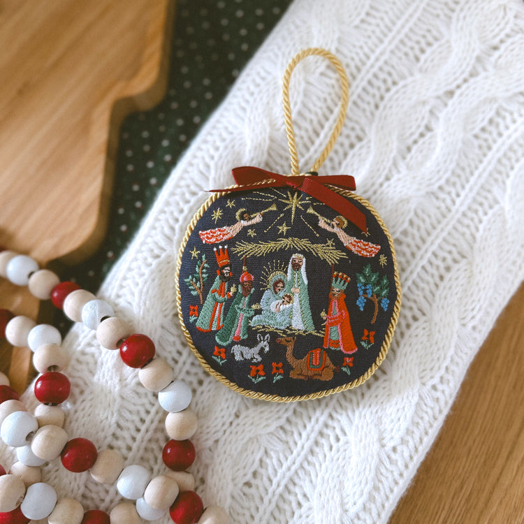 A keepsake gift or heirloom accent for your own tree, this ornament features embroidered illustrations, gold thread detailing, twisted piping, and a loop for hanging.
