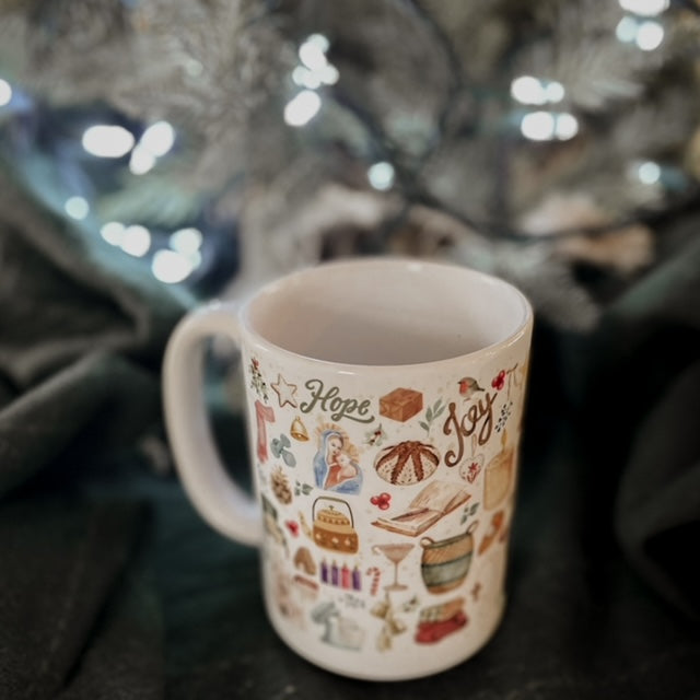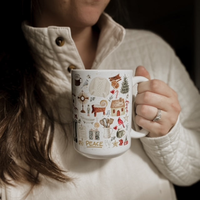 Our M&H founder, Steph Weinert, designed our Cozy & Joy Mug with the vision of inspiring "Catholic mama hygge" this winter. The mug features a delightful collection of images and words that inspire a mother's whole-person wellness: body, mind, and soul.