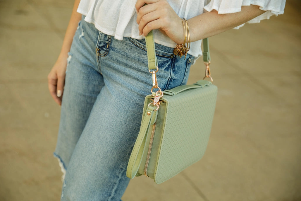 Our sage green Crossbody Bible Cover is designed to blend minimalist desirability with smart functionality. This premium vegan leather Bible Case is for the women who like to carry only the essentials. The Bible Cover is equipped with a detachable wristlet, a convenient spine handle, and a detachable crossbody strap for an effortless carry.