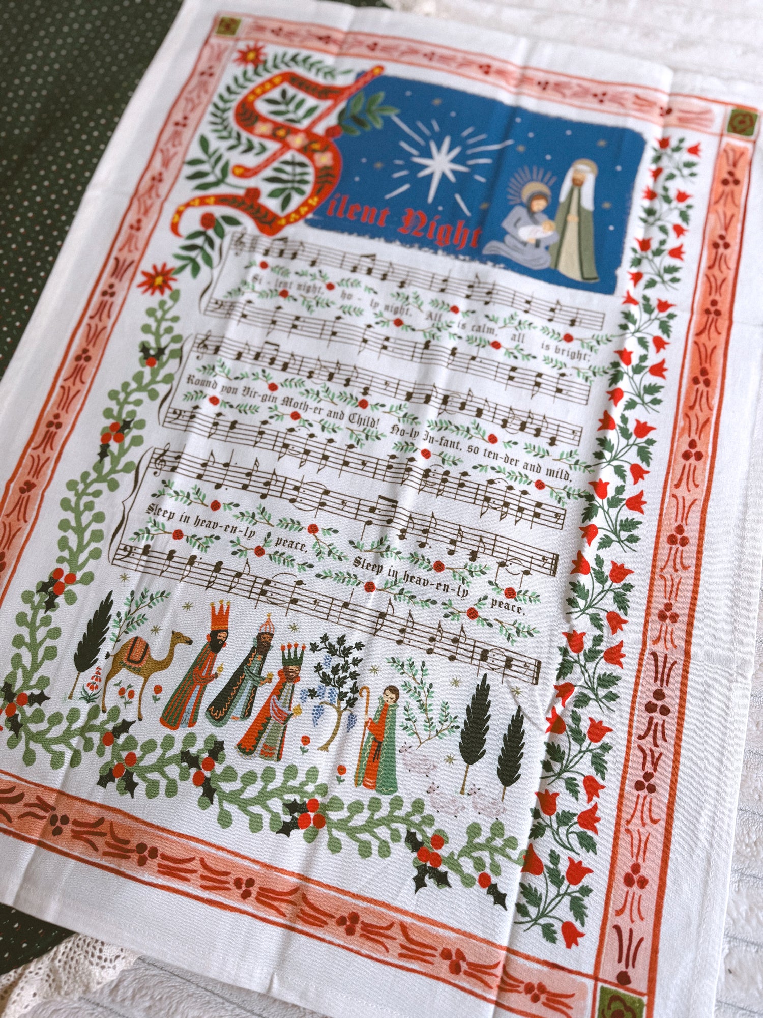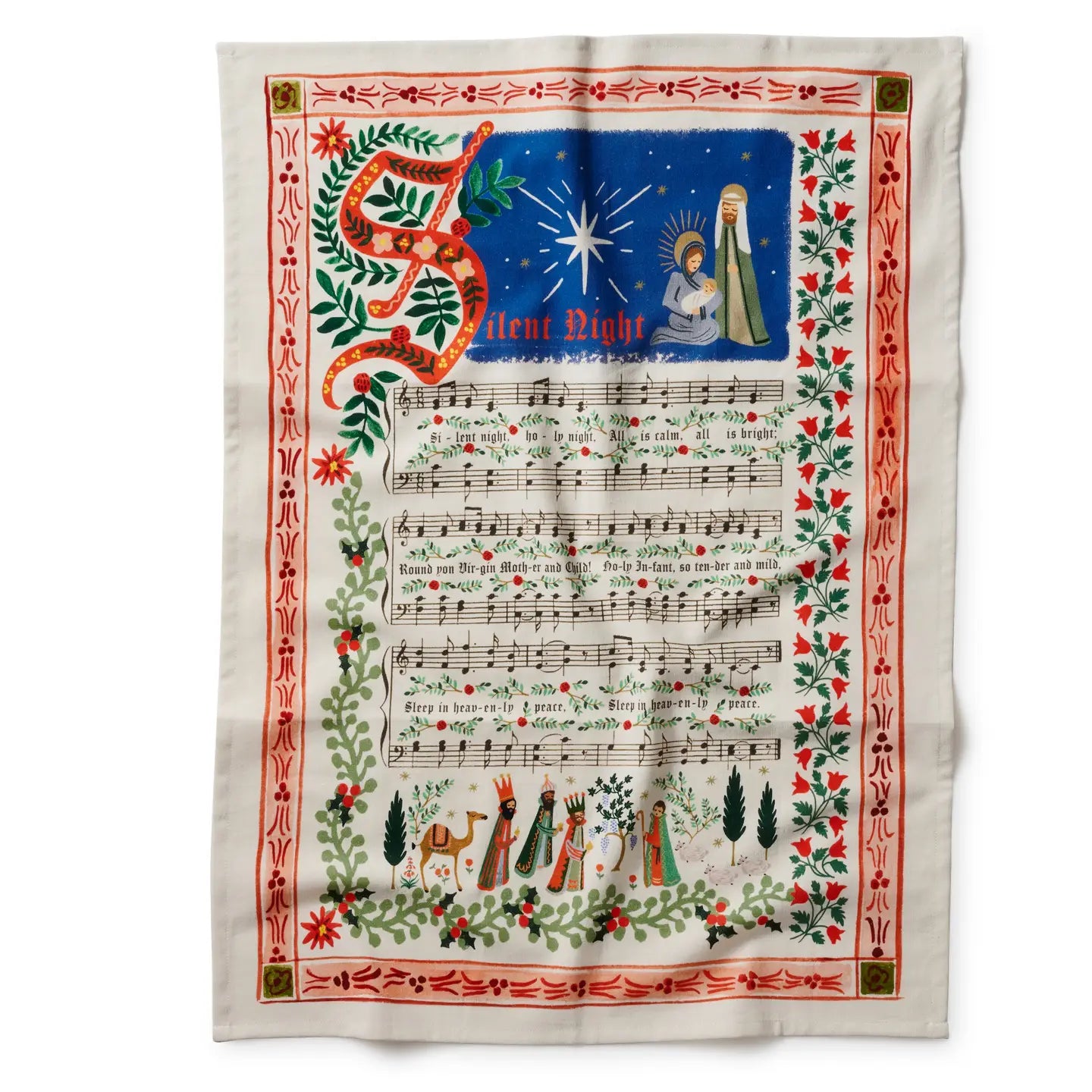 Vibrant and versatile, our printed tea towels are perfect for lining a bread basket, drying dishes, or simply adding a bit of color to the kitchen. Featuring the classic hymn "Silent Night" and a stunning Nativity scene.