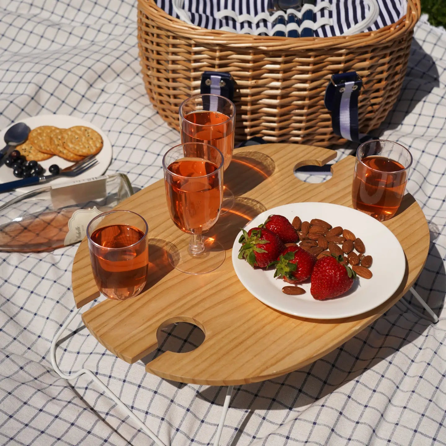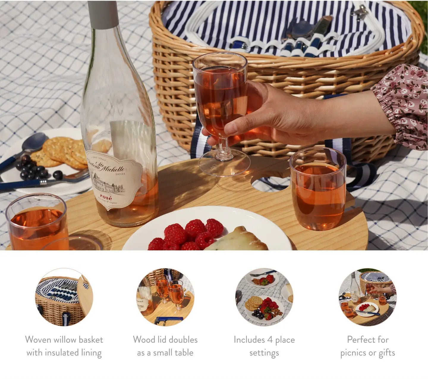 Elevate your picnic experience with this beautiful woven willow basket. The insulated lining zips shut to keep food and drinks cool, while the lid features drink cutouts and collapsible legs. Includes: Woven basket, lid that doubles as a tabletop, corkscrew, and 4 sets of ceramic plates, utensils, napkins, and wine glasses.