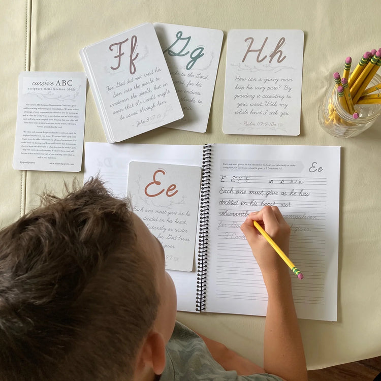 Our ABC Scripture Memorization Cards are a great tool for teaching and training our children. This set comes with a cursive workbook, as well.