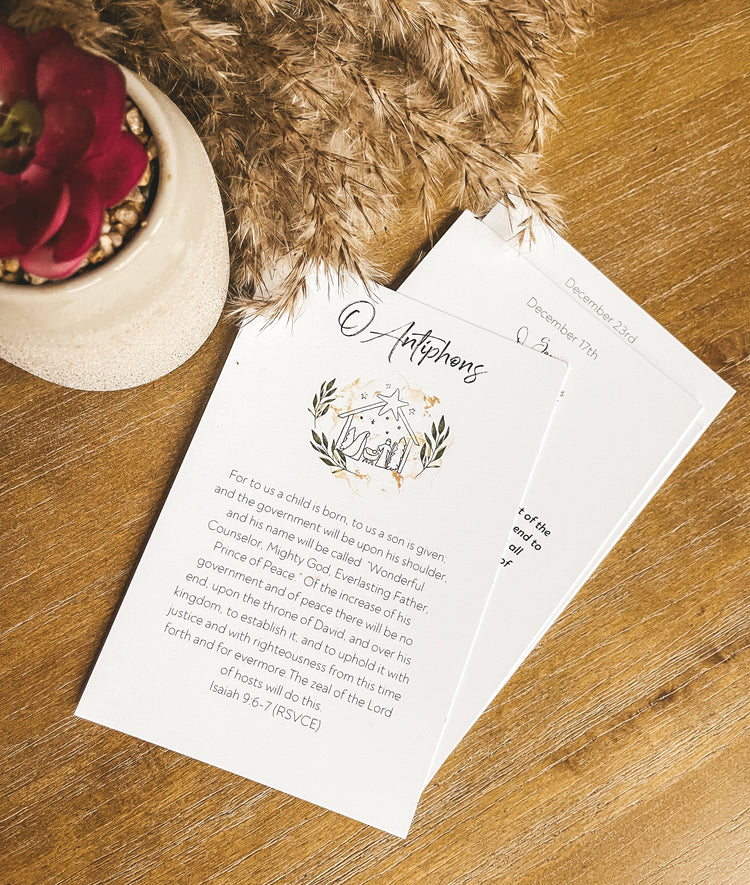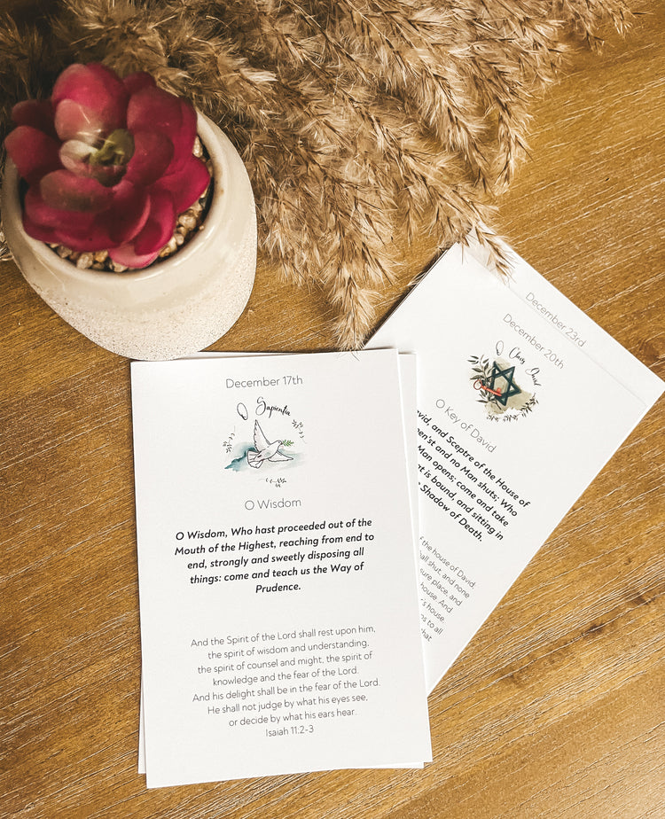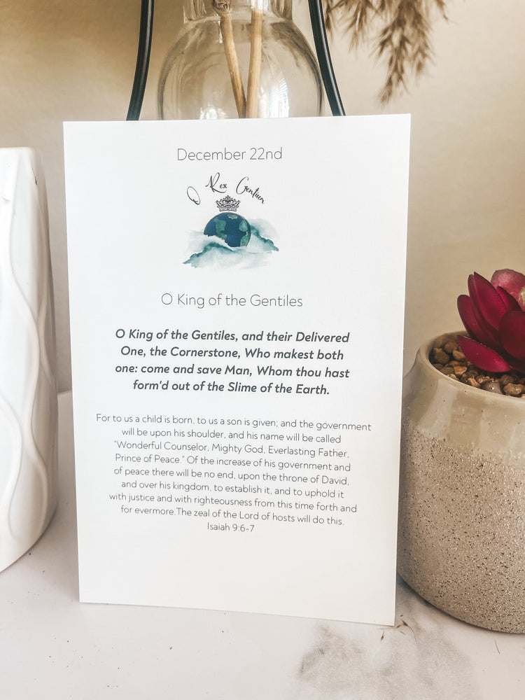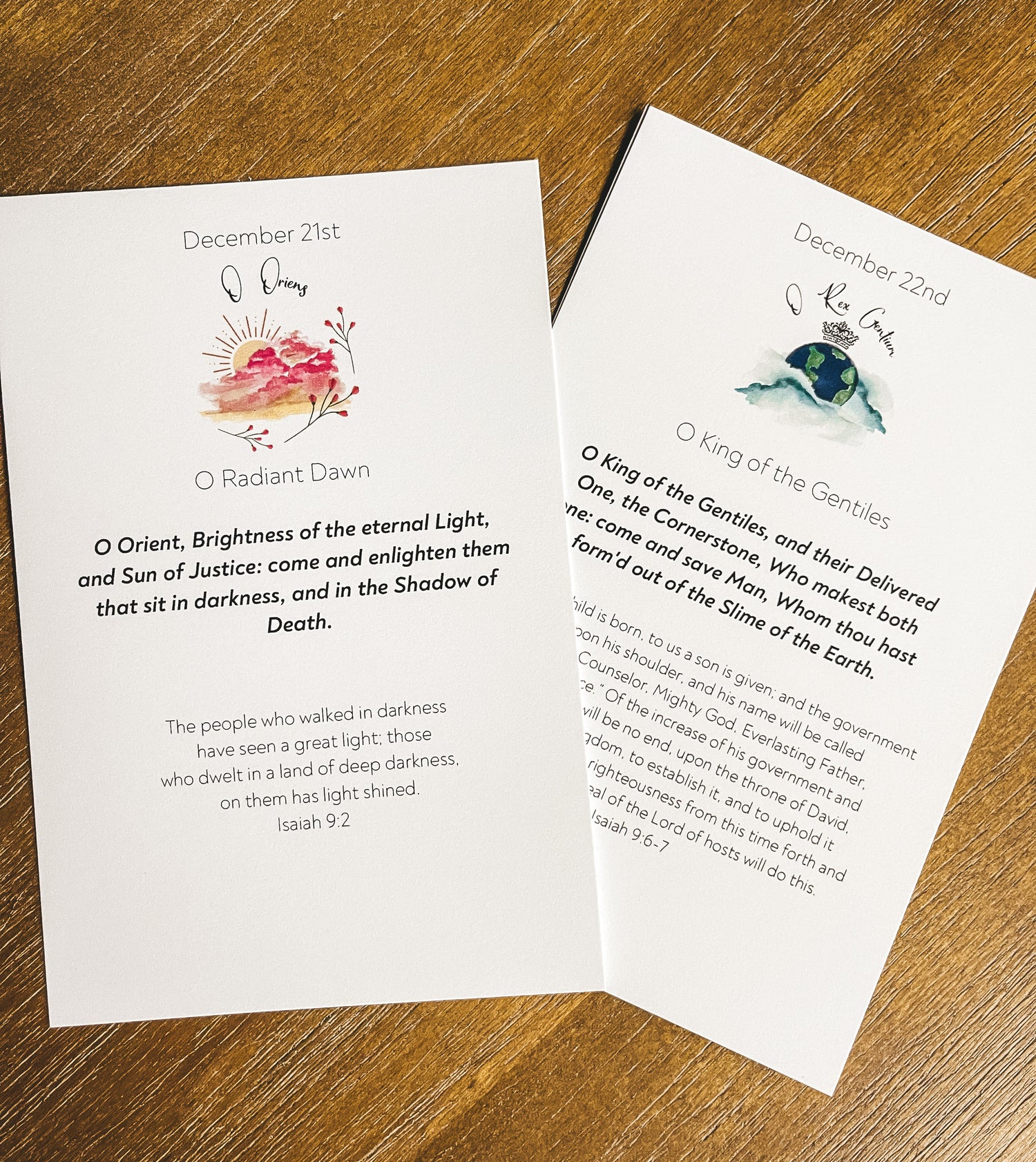 In recent times the O Antiphon prayers have been “edited” and shortened, but we prefer the ancient prayers from the Latin Missal. Our O Antiphons cards feature the original form prayers from a 1700's Latin missal. Each card features the nightly prayer, translated from Latin, as well as the corresponding Scripture passage.