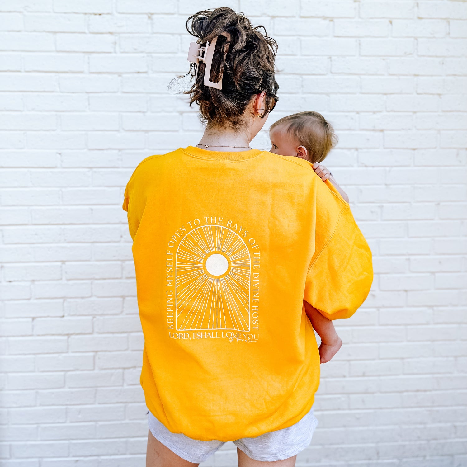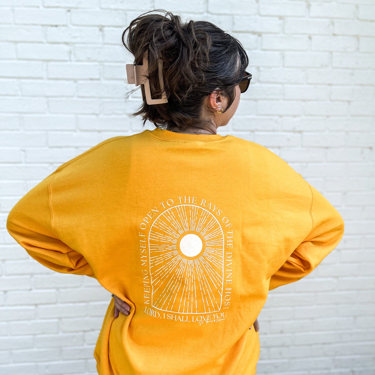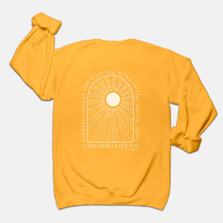 Meet the perfect summer sweatshirt! Bright, summery, cozy, flattering cut, and featuring a monstrance-inspired sun on the front and St. Therese' beautiful words on the back: