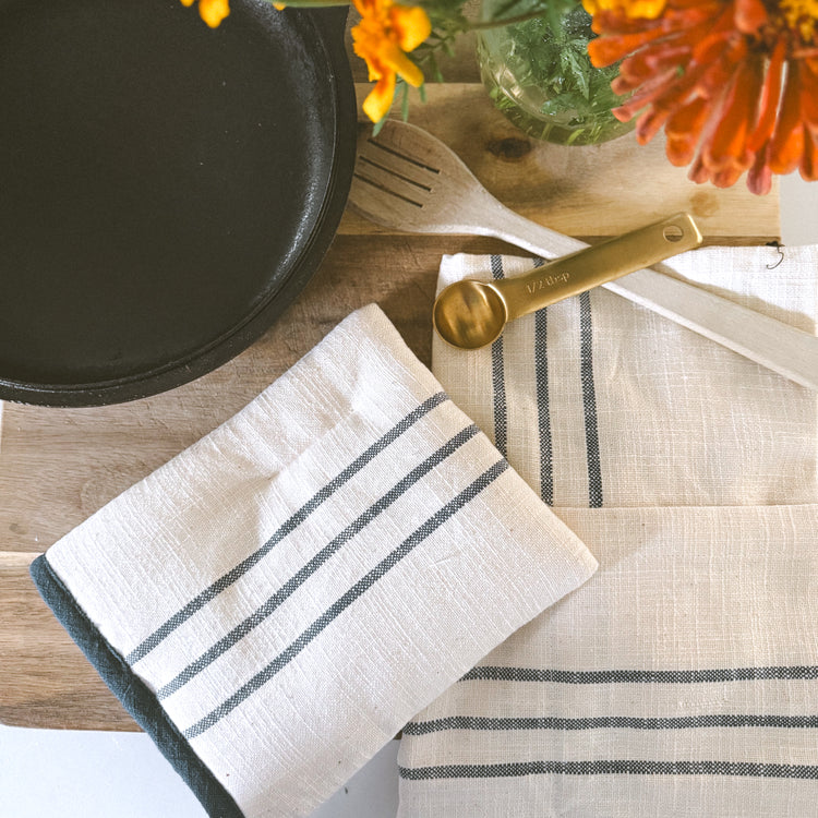 Our vintage-inspired French organic cotton aprons and oven mitts inspire the inner French chef in all of us. The fabric is woven using cotton slub yarns which adds texture and softness. These aprons look and feel as quality and comfortable as they are. Makes a stunning gift set! Comes with one apron and one oven mitt per set.